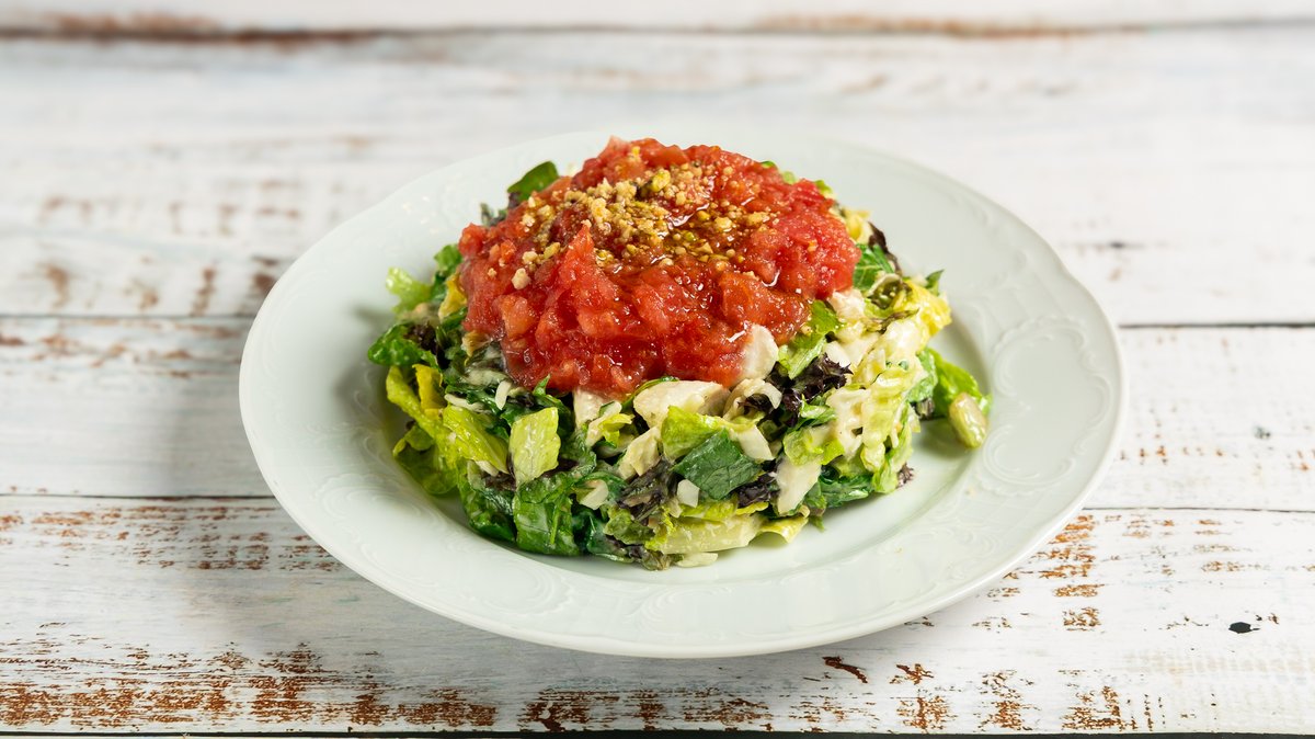 Σαλάτα iceberg, λόλα κόκκινη, κρουτόν, μπέικον, κοτόπουλο, παρμεζάνα και sause Καίσαρα