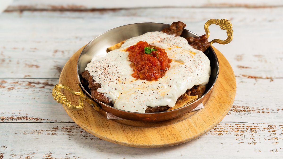 Με χειροποίητη λεπτή πίτα, ψιλοκομμένο μοσχαρίσιο κιμά και λαχανικά. Συνοδεύεται από γιαούρτι με βότανα και σάλτσα Καππαδοκίας