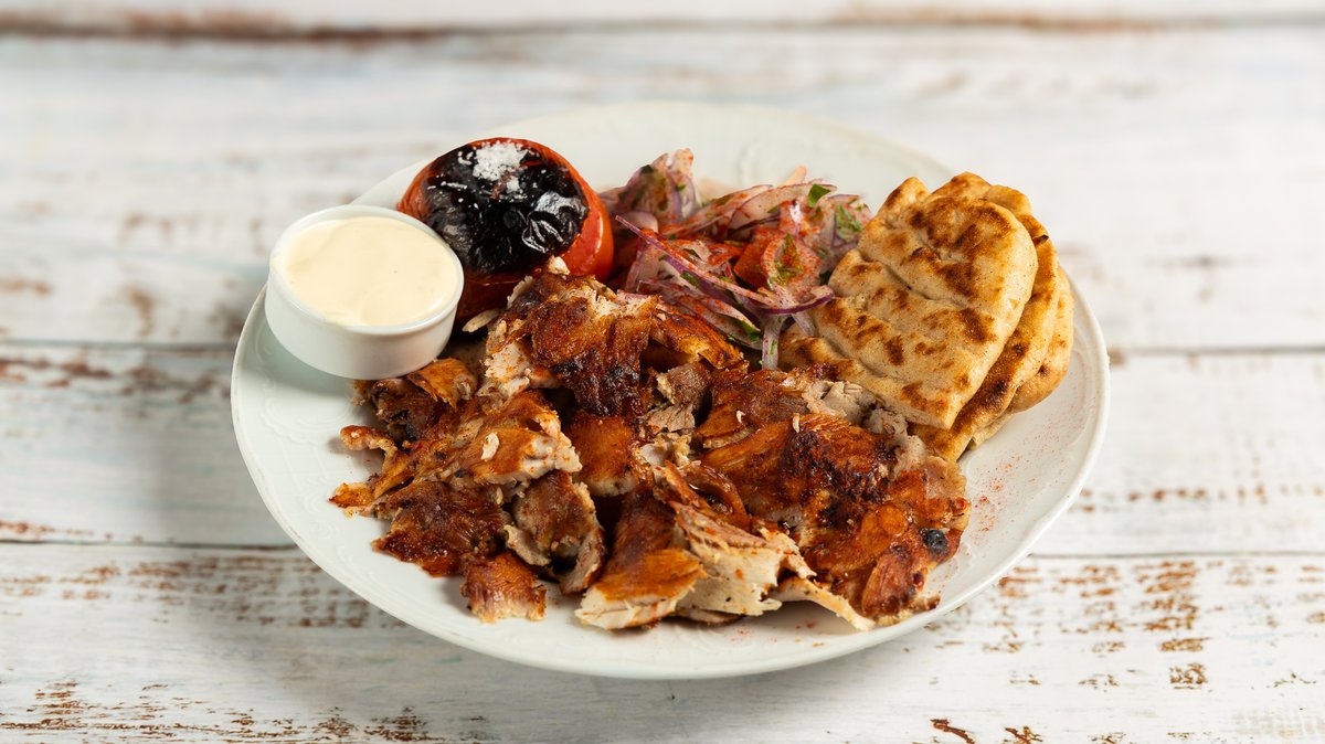 Συνοδεύεται από αλάδωτη πίτα, γιαούρτι, σάλτσα φρέσκιας ντομάτας και σουμάκ