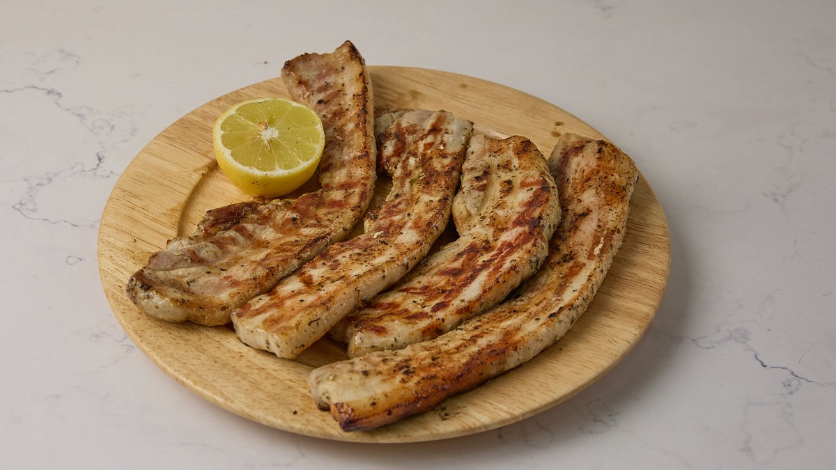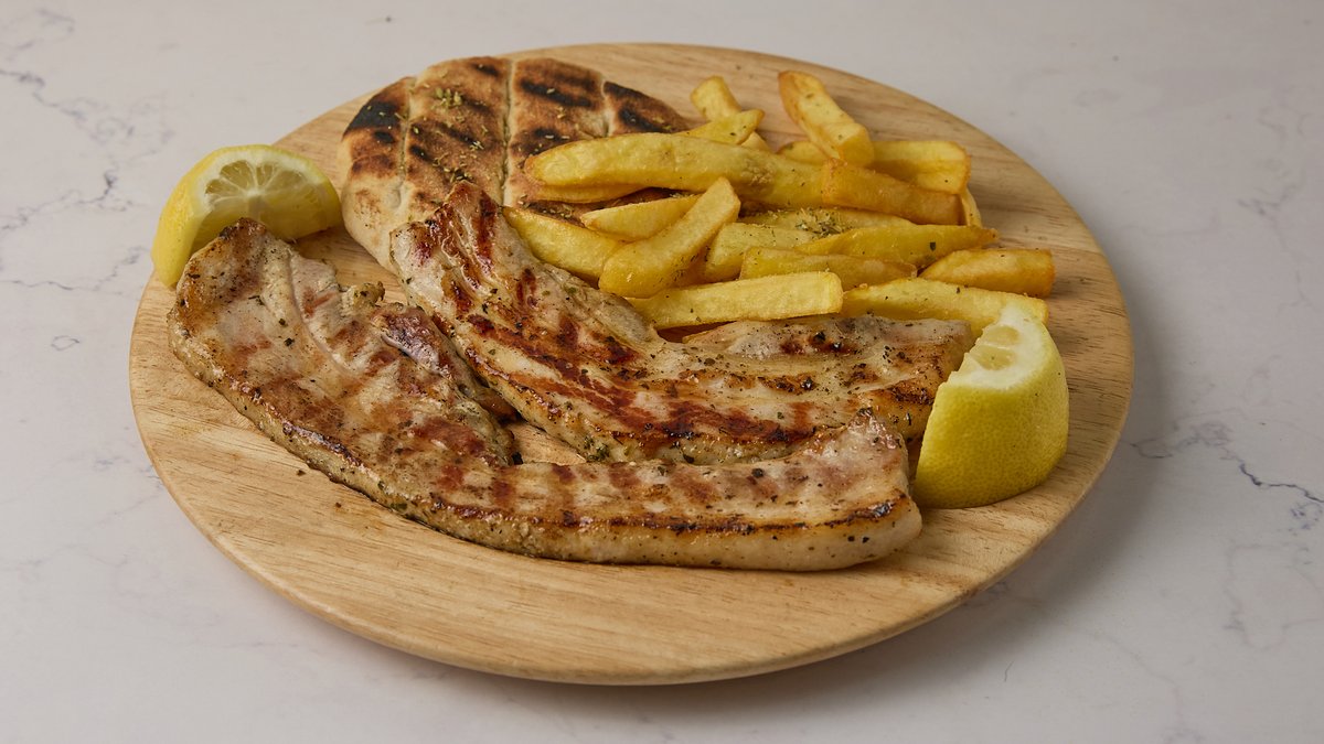 3 Τεμάχια. Συνοδεύεται από πατάτες τηγανητές, ντομάτα, κρεμμύδι, τζατζίκι και πίτα