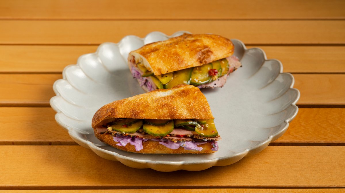 Πανίνι με λιωμένη γραβιέρα, παστράμι πιπεριού, σπιτική σαλάτα coleslaw, πικάντικες πίκρες αγγουριού με σουσάμι. Pepper pastrami sandwich, homemade coleslaw, spiced pickled cucumber with sesame, melted gruyere.