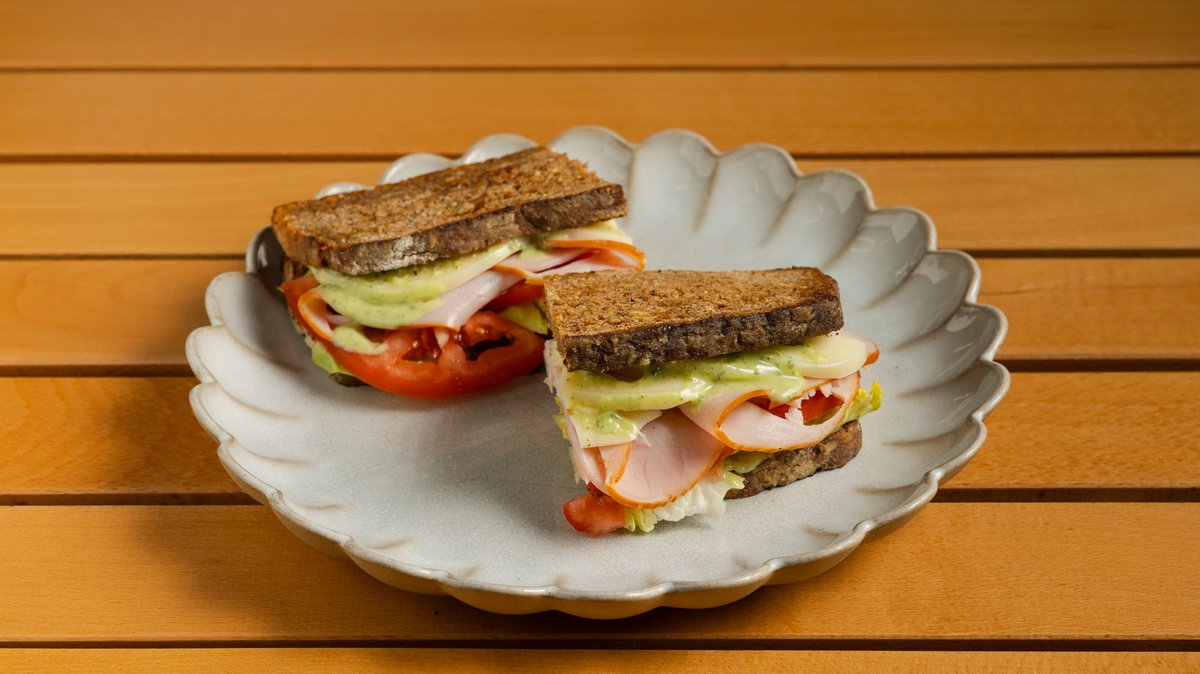 Ψωμί Ζέας , ψητή γαλοπούλα, τυρί προβολόνε, πέστο αγιολί (περιέχει σκόρδο). Zea flour bread, roasted turkey, provolone cheese, pesto aioli (contain garlic)