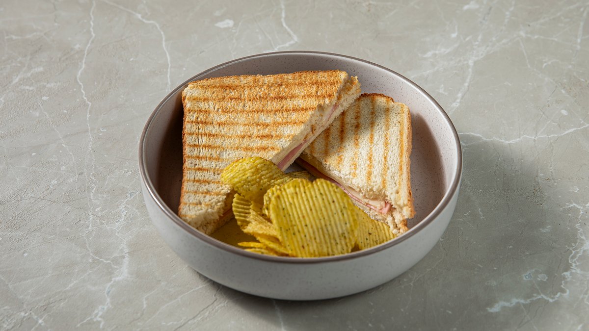 Με ζαμπόν και gouda. Συνοδεύεται από πατατάκια