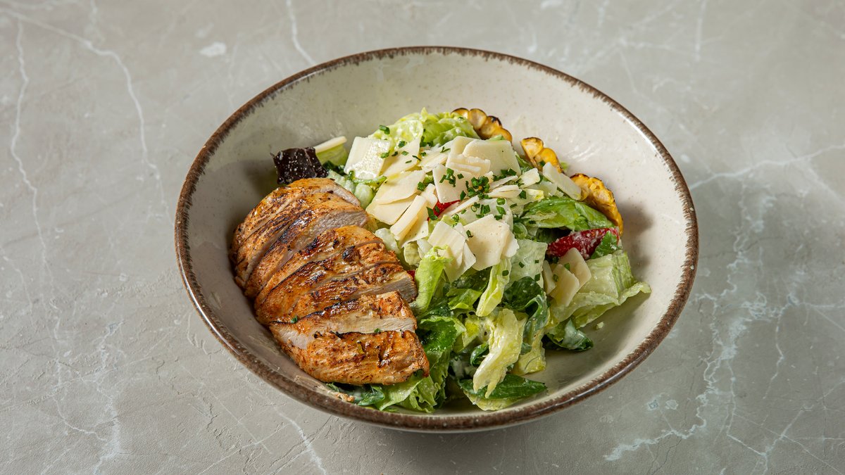 Σαλάτα με στήθος κοτόπουλο, ντοματίνια, κρουτόν, καλαμπόκι, παρμεζάνα και χειροποίητη Caesar`s dressing
