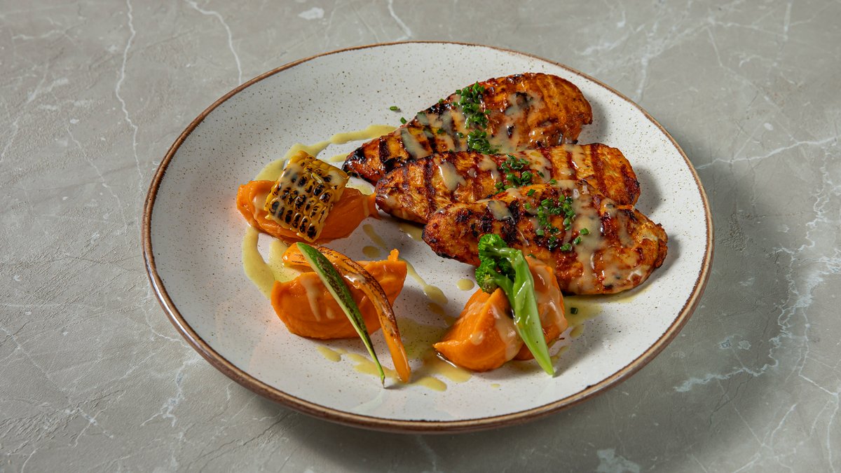 Συνοδεύεται από πουρέ γλυκοπατάτας, καλαμπόκι ψητό, καρότο baby και λαδολέμονο