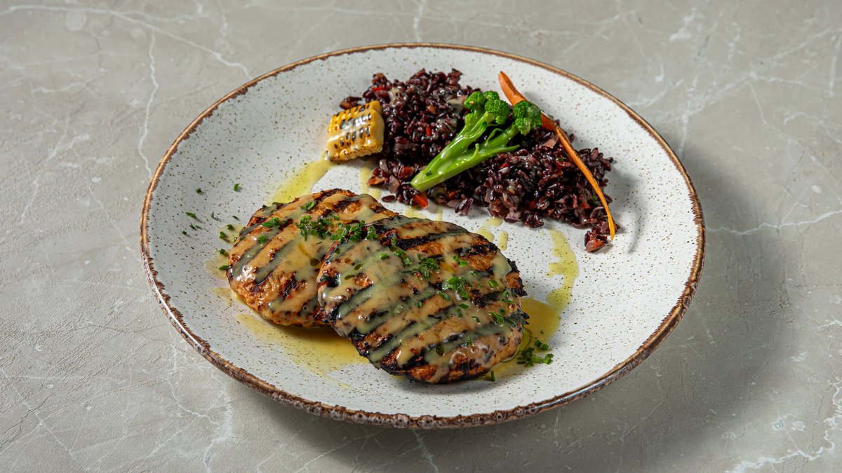 2 Τεμάχια. Συνοδεύεται από ρύζι μαύρο αρωματισμένο με μυρωδικά φρέσκα και καρότα baby