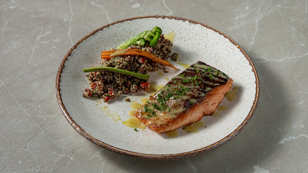 Συνοδεύεται από σαλάτα quinoa, μυρωδικά εποχής φρέσκα και citronella βασιλικού