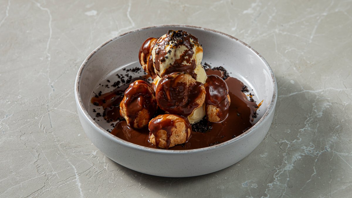 Με σάλτσα σοκολάτας και 1 μπάλα παγωτό βανίλια