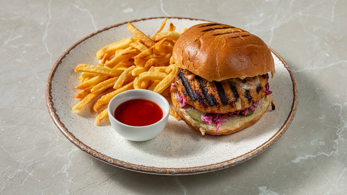Με χειροποίητο μπιφτέκι κοτόπουλο 200g, coleslaw, πίκλα αγγούρι και mayo chili sauce. Συνοδεύεται από πατάτες τηγανητές