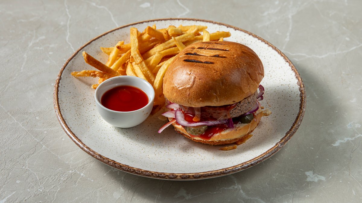 Ψωμί brioche με χειροποίητο μπιφτέκι μοσχαρίσιο black Angus 200g, cheddar, πίκλα αγγούρι και BBQ sauce. Συνοδεύεται από πατάτες τηγανητές