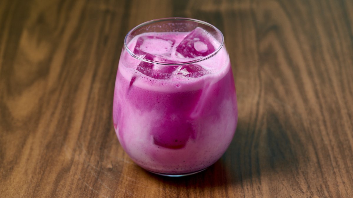 Οργανικό ροζ dragonfruit με γάλα. Σερβίρεται κρύο ή ζεστό.
