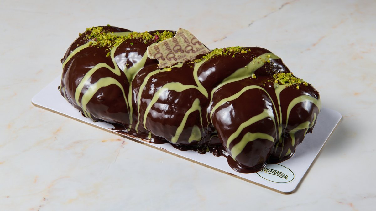 10 Ατόμων. Αφράτο τσουρέκι γεμισμένο με πλούσια πραλίνα Dubai (συνδυασμό φιστικιού και καταιφιού) σοκολάτας και επικάλυψη λευκής σοκολάτας και σοκολάτας κακάο. Μια πολυτελής σοκολατένια εμπειρία που συναρπάζει