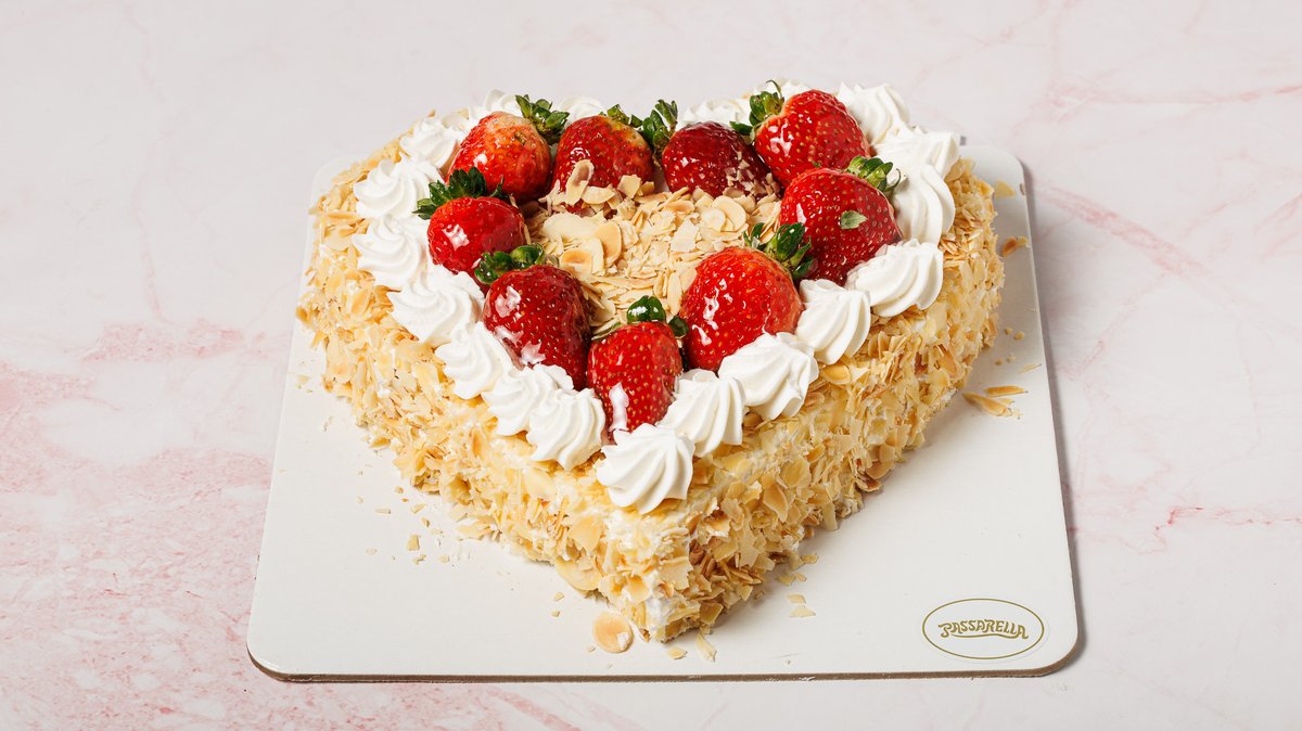 Απαλό λευκό παντεσπάνι, φίνα κρέμα patisserie και τραγανά καραμελωμένα αμύγδαλα. Κομψή, ελαφριά και διαχρονική επιλογή