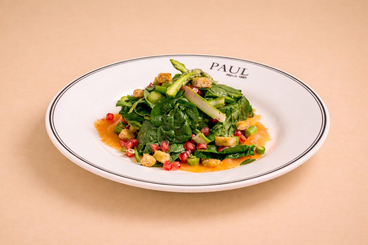 Σαλάτα με καπνιστό σολομό Νορβηγίας, baby σπανάκι, ψητά σπαράγγια, αβοκάντο, ρόδι και vinaigrette από ξύδι framboise
