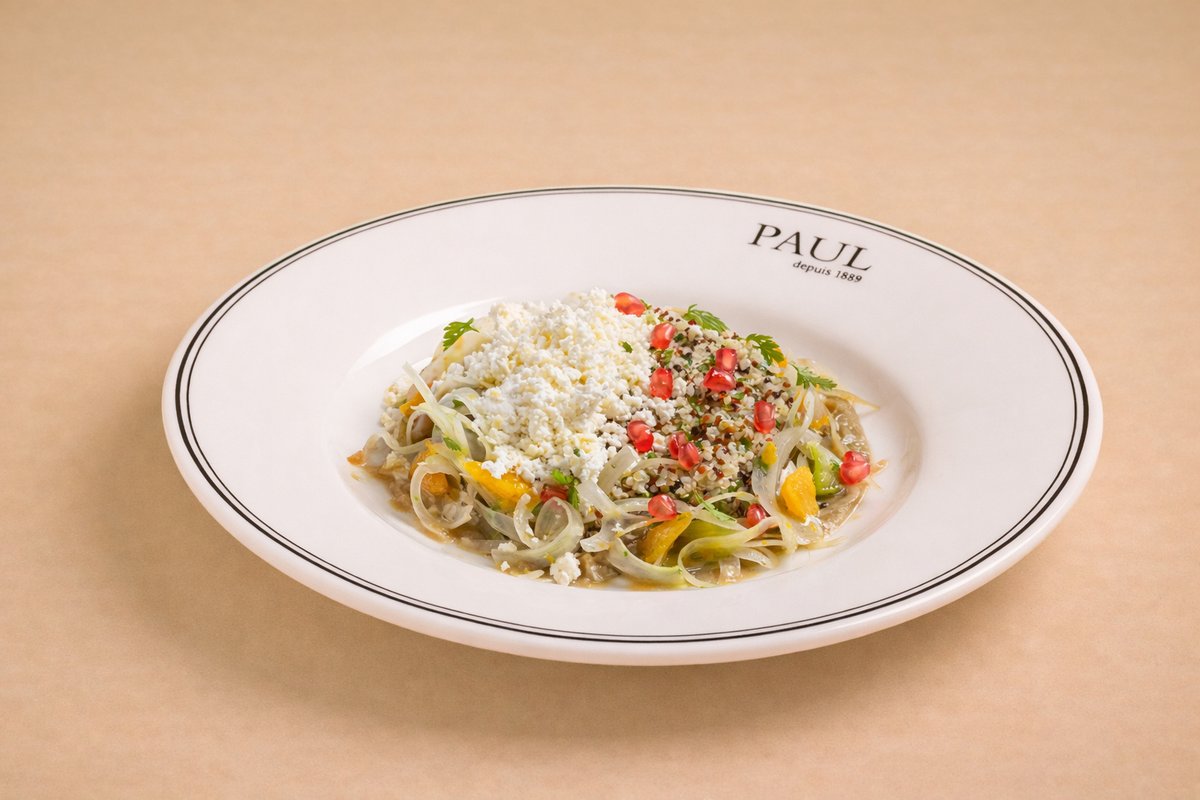 Τρίχρωμη βιολογική κινόα με ψητή μελιτζάνα, ανθότυρο, φινόκιο, πορτοκάλι, ρόδι και vinaigrette εσπεριδοειδών