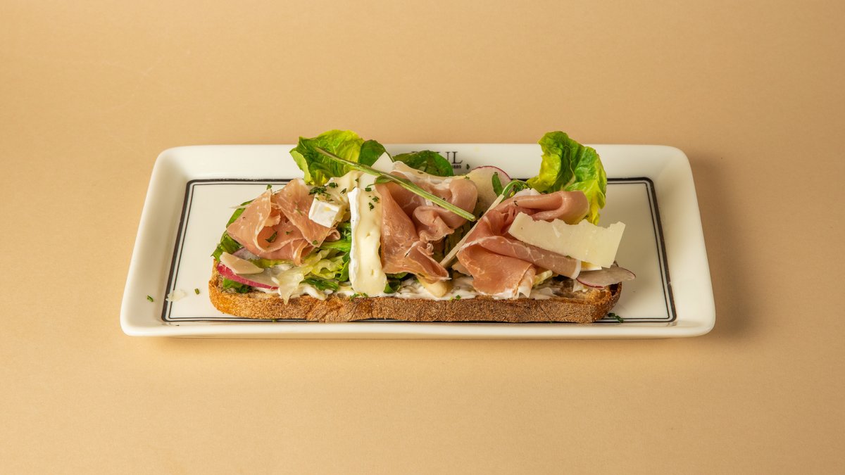 Απολαυστικό φρυγανισμένοχωριάτικο προζυμένιο ψωμί με ψητό ζαμπόν, emmental mix και μπεσαμέλ.