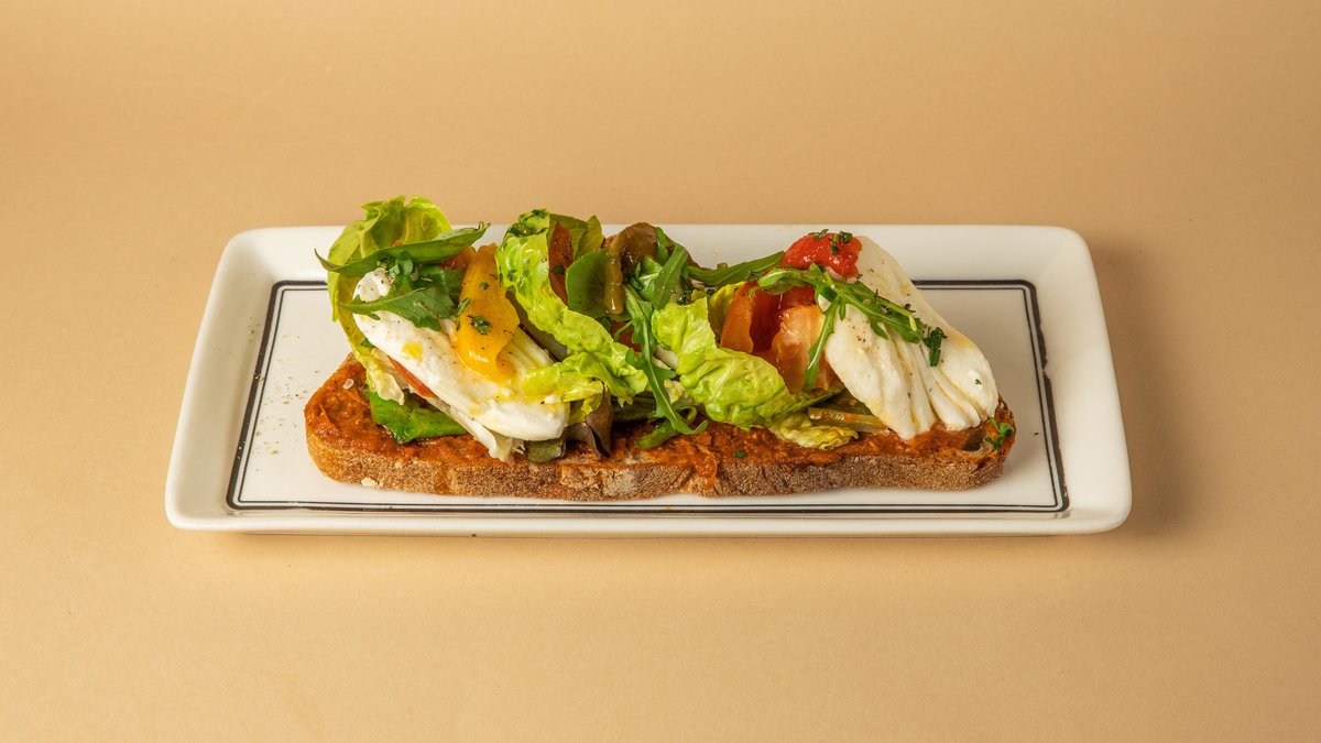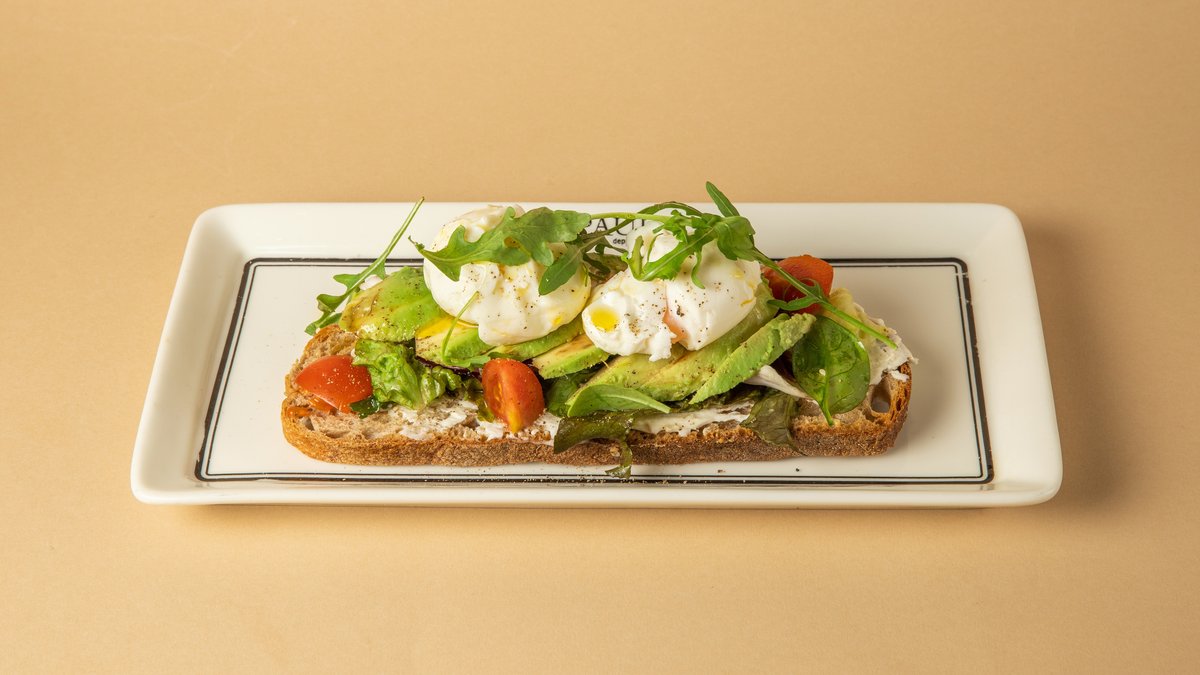 Κρέμα αβοκάντο, τυρί mascarpone, βραστό αυγό 4 λεπτών, ντοματίνια, μαρούλι baby gem και ρόκα σε χωριάτικο ψωμί με προζύμι