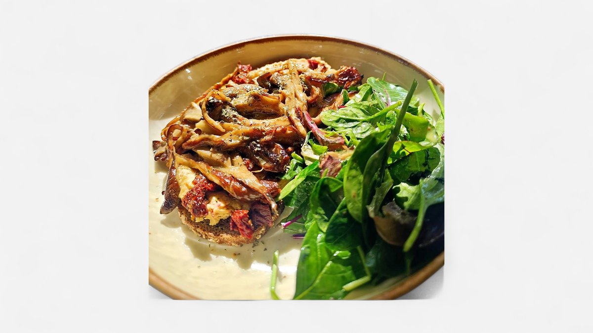 Με χούμους, μανιτάρι πλευρώτους ψητό, λιαστή ντομάτα και αγγούρι
