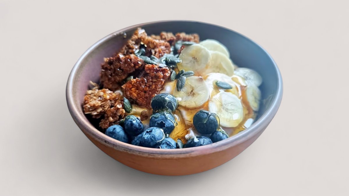 Γιαούρτι με φρούτα του δάσους, μπανάνα, γάλα αμυγδάλου, granola, κολοκυθόσπορο, μέλι και ταχίνι