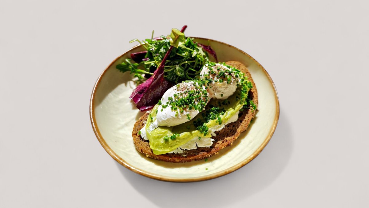 Με κρέμα avocado, πράσινο tabasco, lime, λάδι μαϊντανού, ανθότυρο και δύο αυγά ποσέ πάνω σε ψωμί dinkel