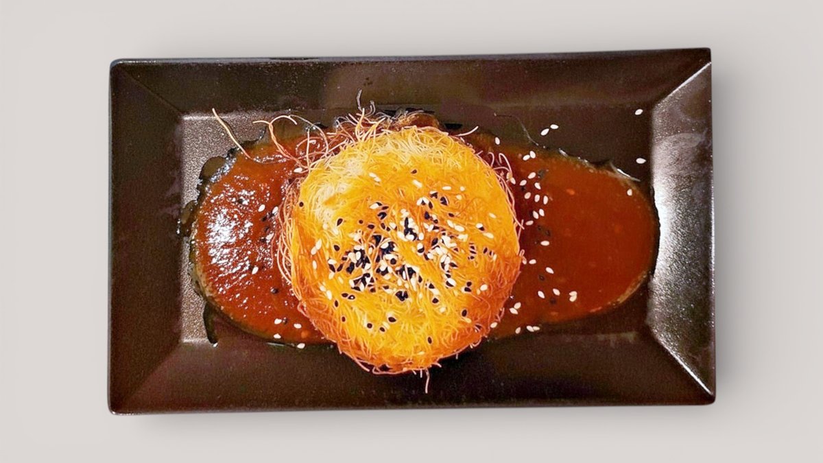 Με φύλλο κανταΐφι, φέτα, ανθότυρο, μπλε τυρί, χειροποίητη μαρμελάδα ντομάτας και μαυροσούσαμο