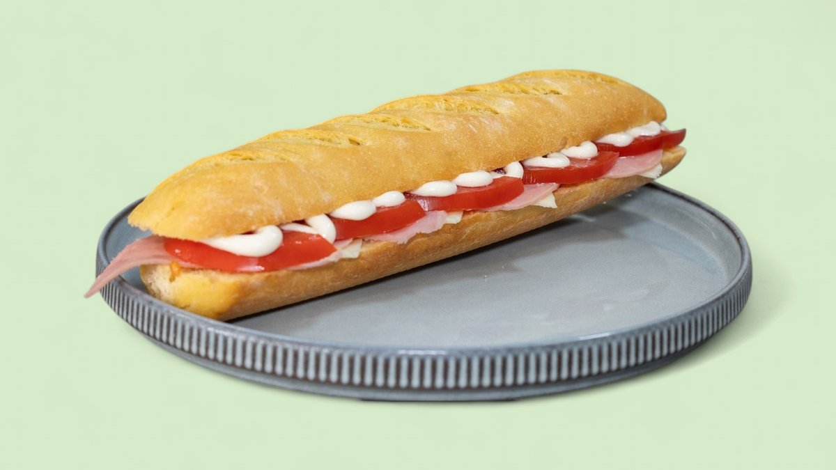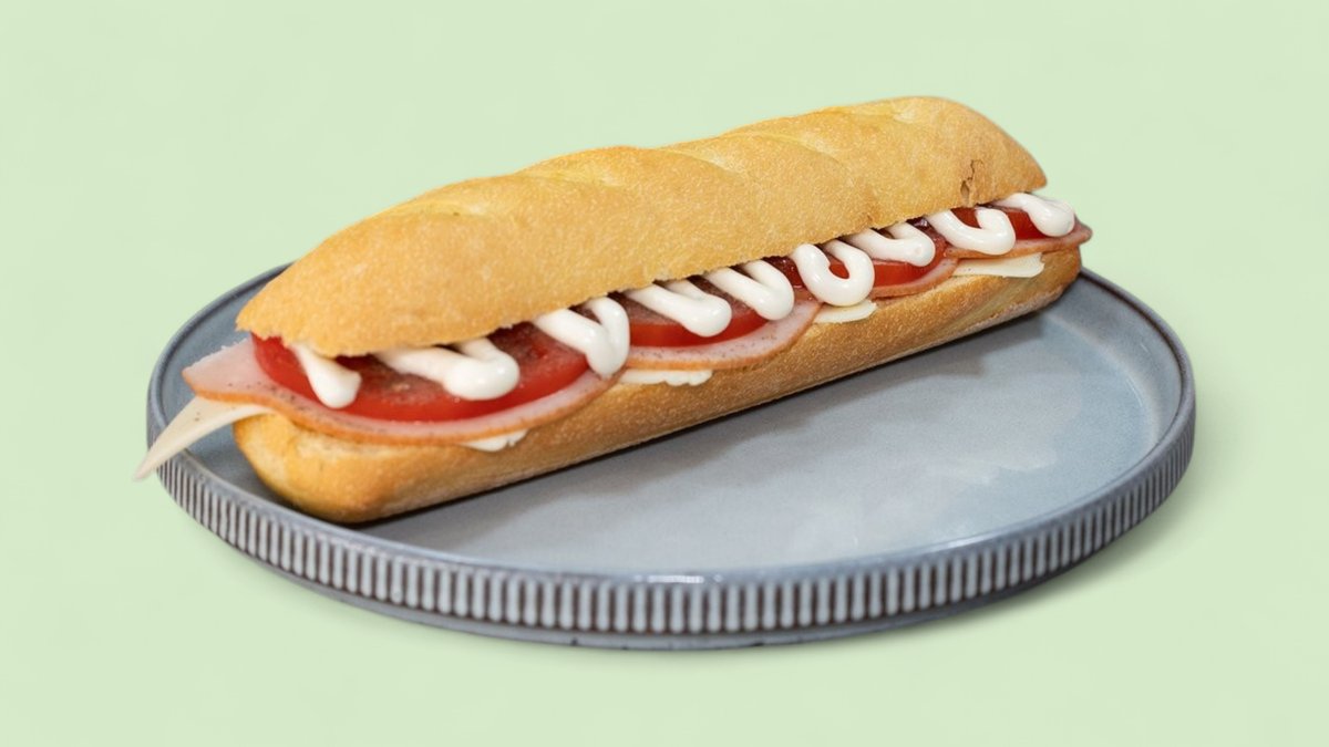 Βιενέζικη μπαγκέτα, χοιρινή ωμοπλάτη, Γκούντα, τομάτα, μαγιονέζα