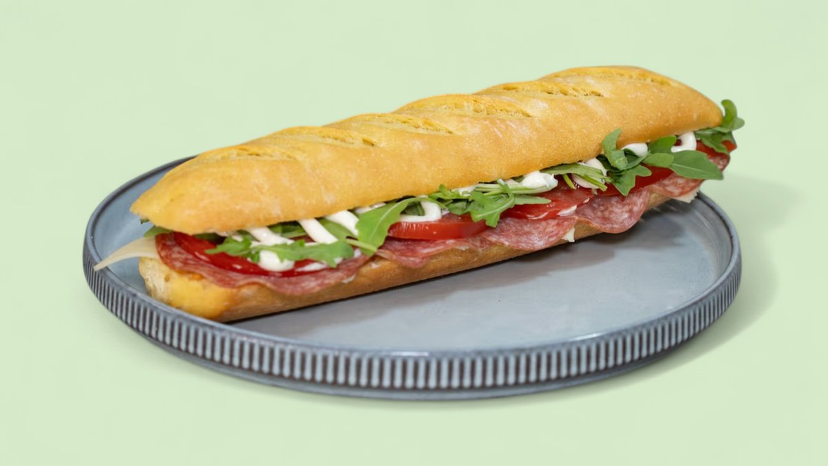 Βιενέζικη Μπαγκέτα, σαλάμι Αέρος, Γκούντα, τομάτα, ρόκα, μαγιονέζα