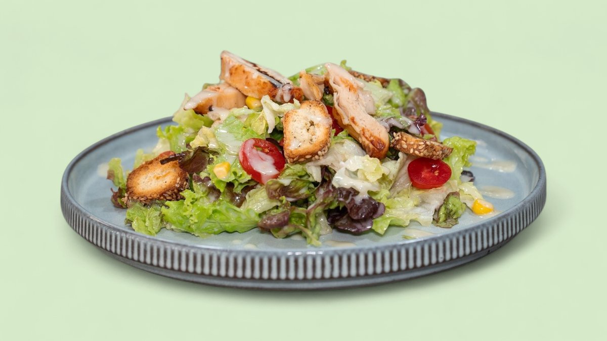 Πράσινη και Κόκκινη λόλα, Καλαμπόκι, Τοματίνια, Κοτοπούλο Φιλέτο, Κρουτόν, Σος Ceasar