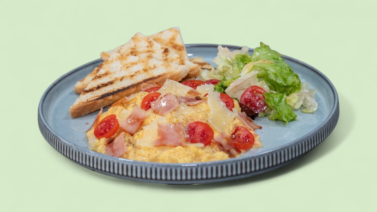 Με 3 αυγά, μπέικον, παρμεζάνα, ντοματίνια και βούτυρο