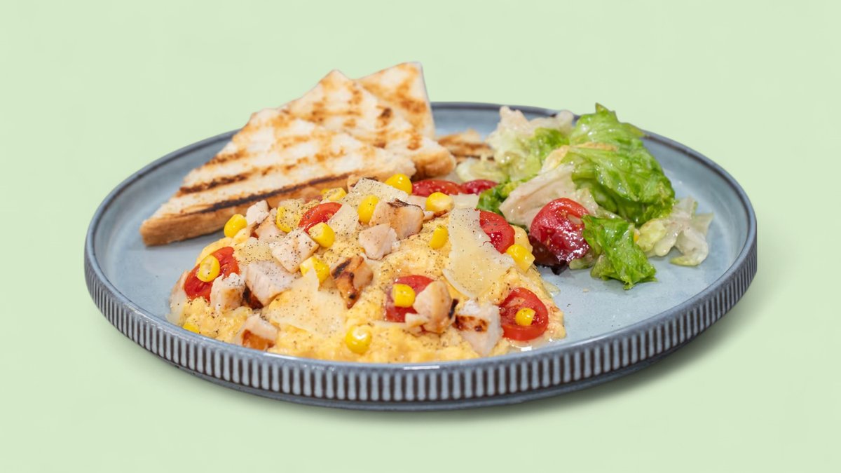 Με 3 αυγά, φιλέτο κοτόπουλο, καλαμπόκι, ντοματίνια, gouda και βούτυρο