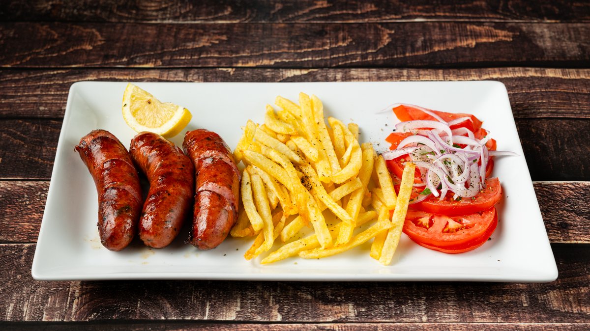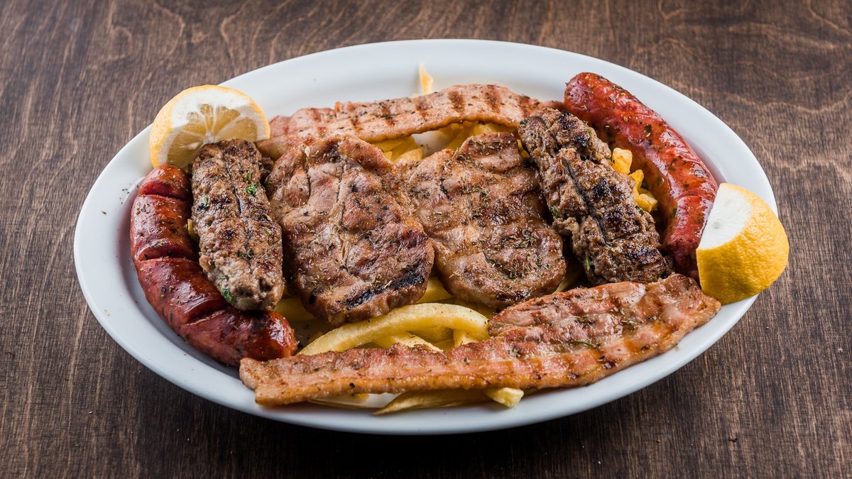 Με 2 μπριζολάκια χοιρινά, 2 μπιφτέκια, 2 πανσέτες 2 λουκάνικα πατατες, πιτα κ σπιτικη μουσταρδα