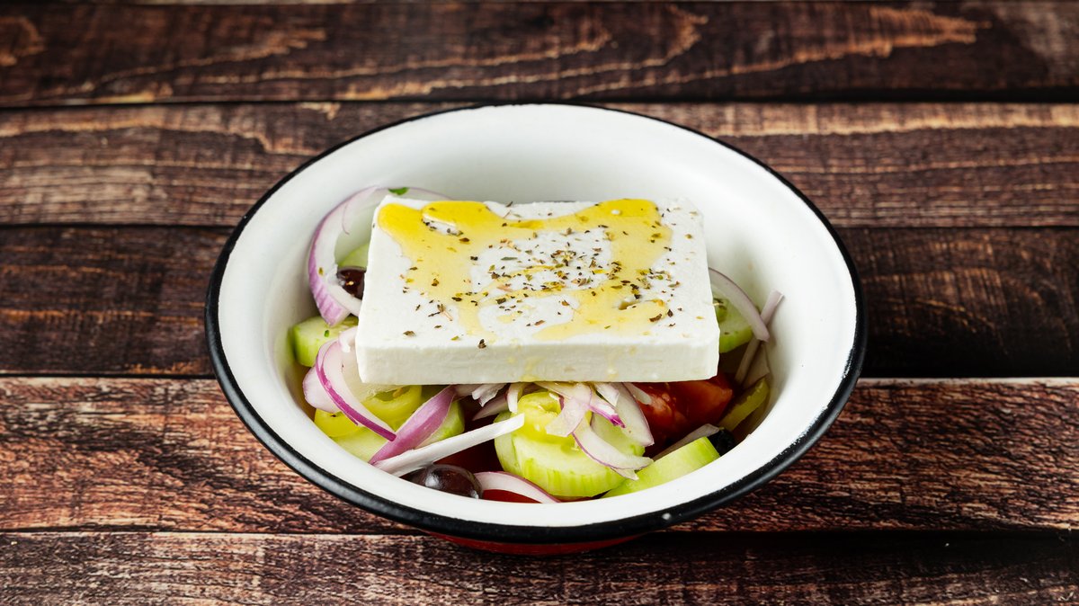 Με φέτα, ντομάτα, αγγούρι, κρεμμύδι, ελιές, πιπερια, ρίγανη και ελαιόλαδο