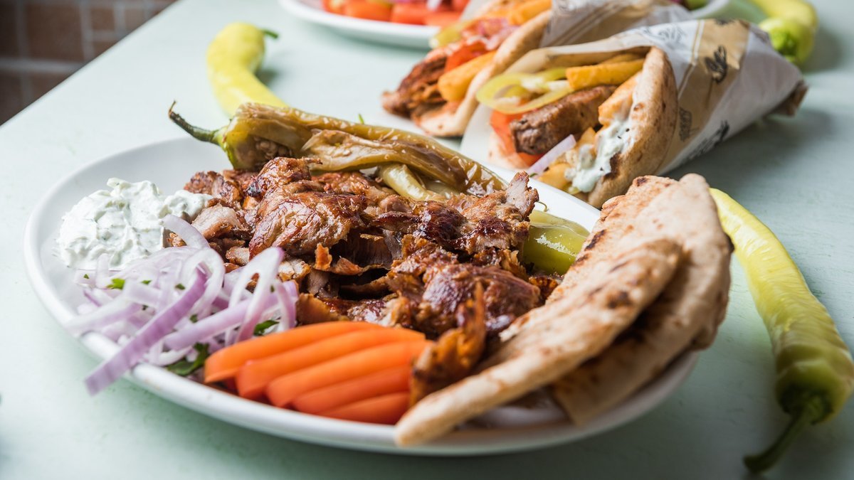 Συνοδεύεται από πατάτες, πιπεριές, κρεμμύδι, τζατζίκι, ντομάτα και πίτα