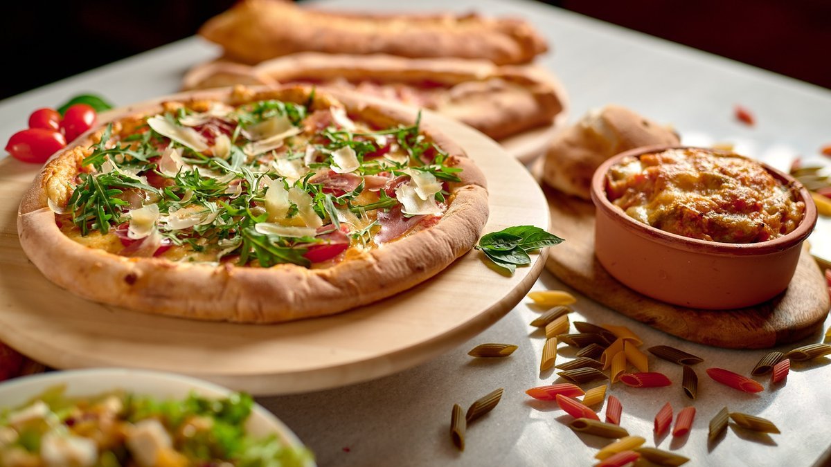 Σάλτσα ντομάτας, τυρί, μοτσαρέλα, προσούτο, ρόκα, ντοματίνια, παρμεζάνα