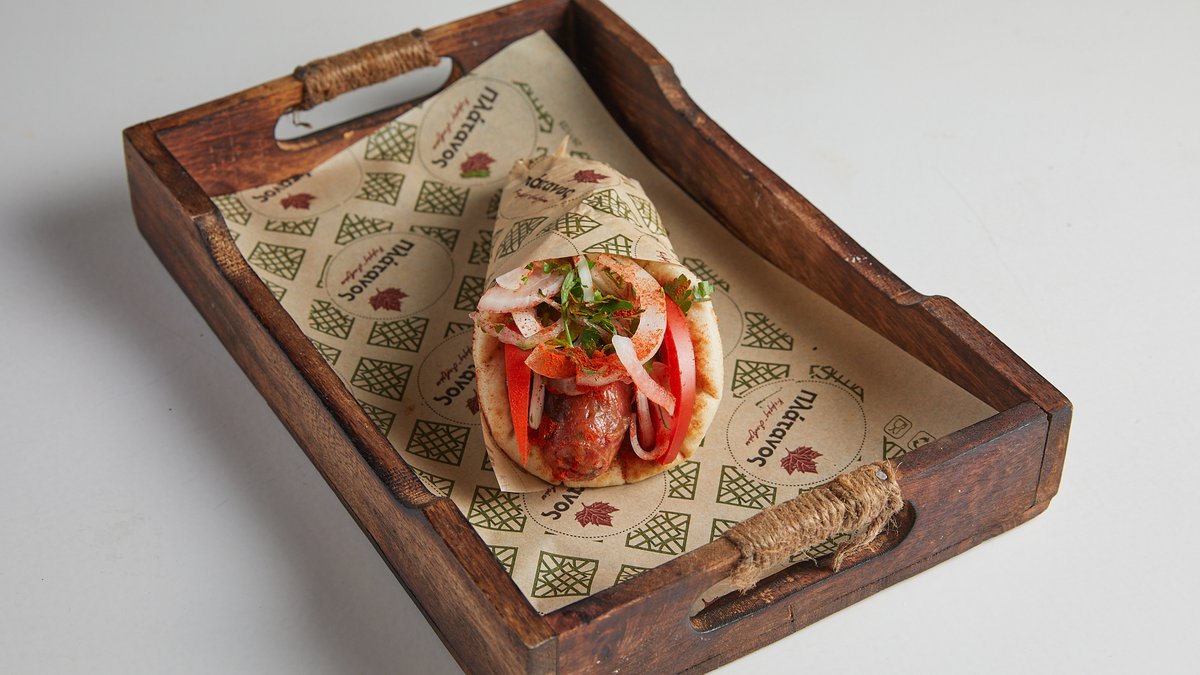 Από 100 % μοσχαρίσιο κιμά, αλάδωτη πίτα, ψητή ντομάτα, κρεμμυδάκι, μαϊντανό και σως φέτα-πιπεριά