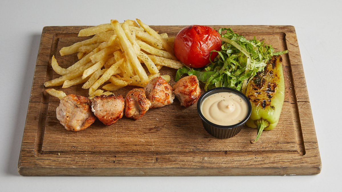 2 Σούβλες. Συνοδεύεται από πατάτες τηγανητές, πίτες, ψητή πιπεριά, ψητή ντομάτα, κρεμμύδι, μαϊντανό και σως γιαουρτιού