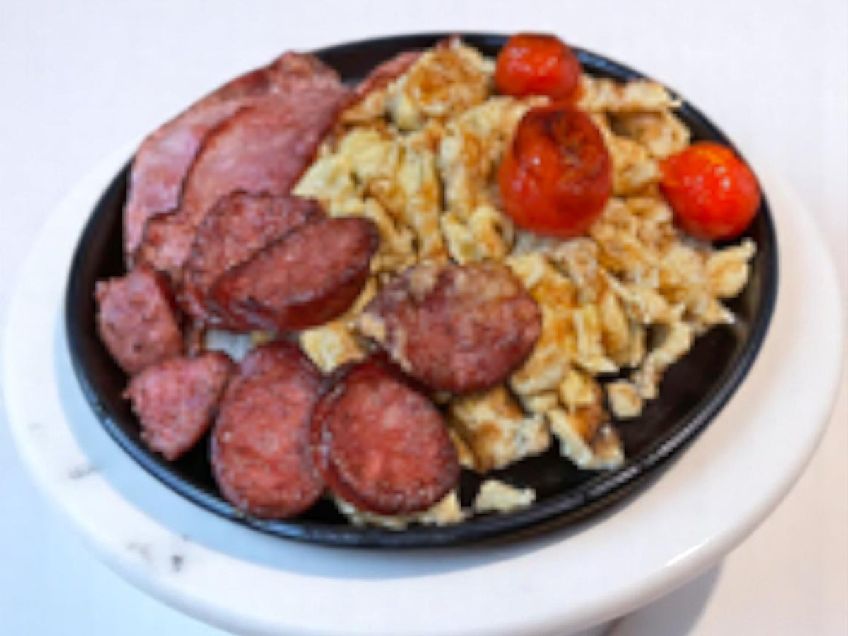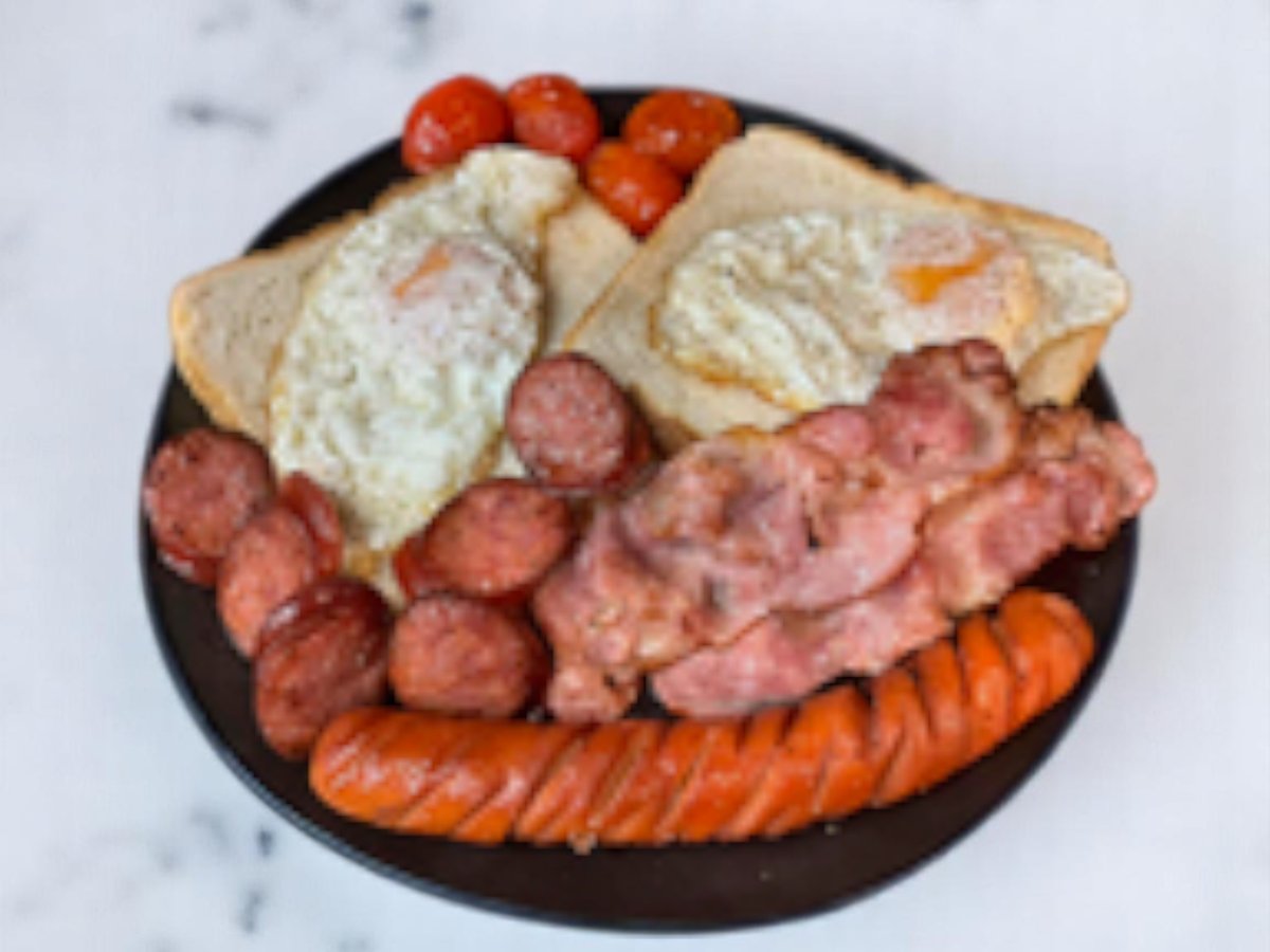 2 Ψωμί του τόστ, 2 αυγά μάτια, λουκάνικα Φρανκφούρτης, λουκάνικο χωριάτικο, μπέικον, ψητά ντοματίνια