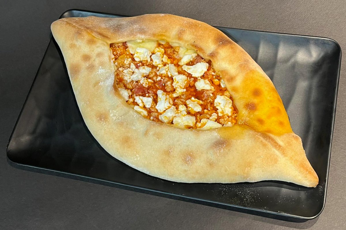 Με λουκάνικο μοσχαρίσιο, φέτα, gouda, μοτσαρέλα, πιπεριές και σάλτσα ντομάτας