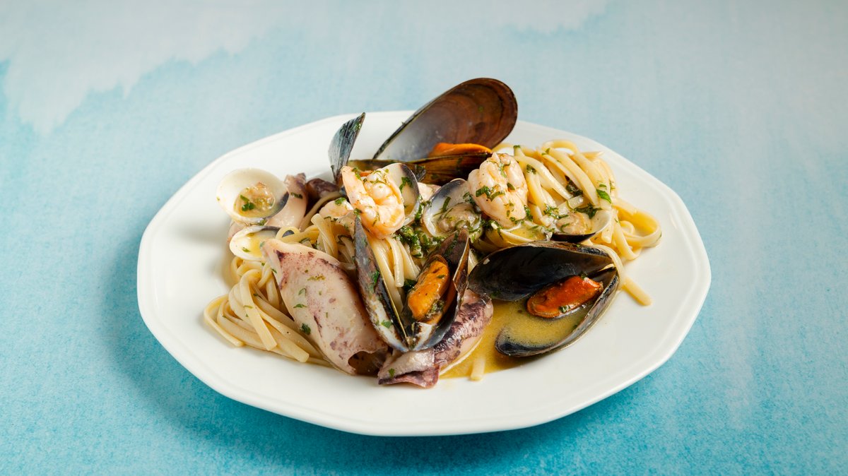 Vongole, μύδια,γαρίδες,καλαμάρι με λευκή σάλτσα κρασιού και μυρωδικά.