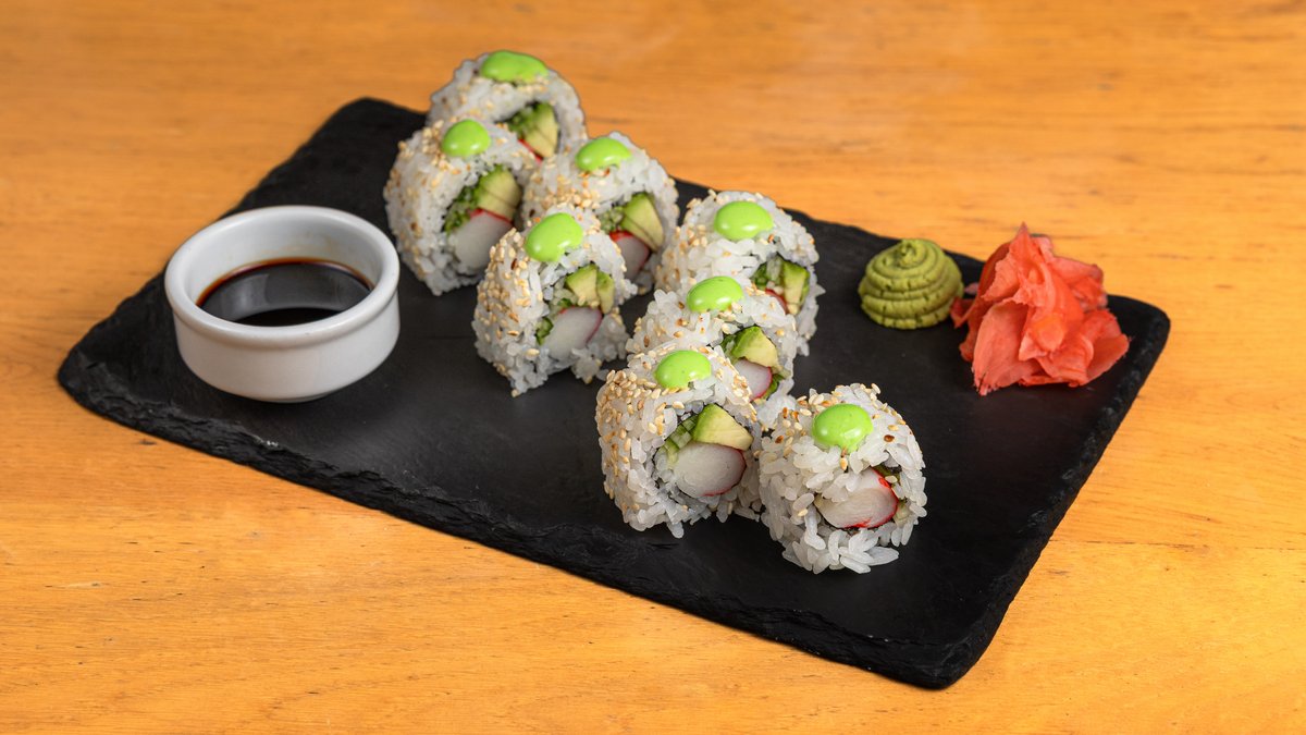 8 Rolls. Καβούρι, αγγούρι, αβοκάντο, λευκό σουσάμι, ρύζι ατμού, nori, σάλτσα wasabi mayo
