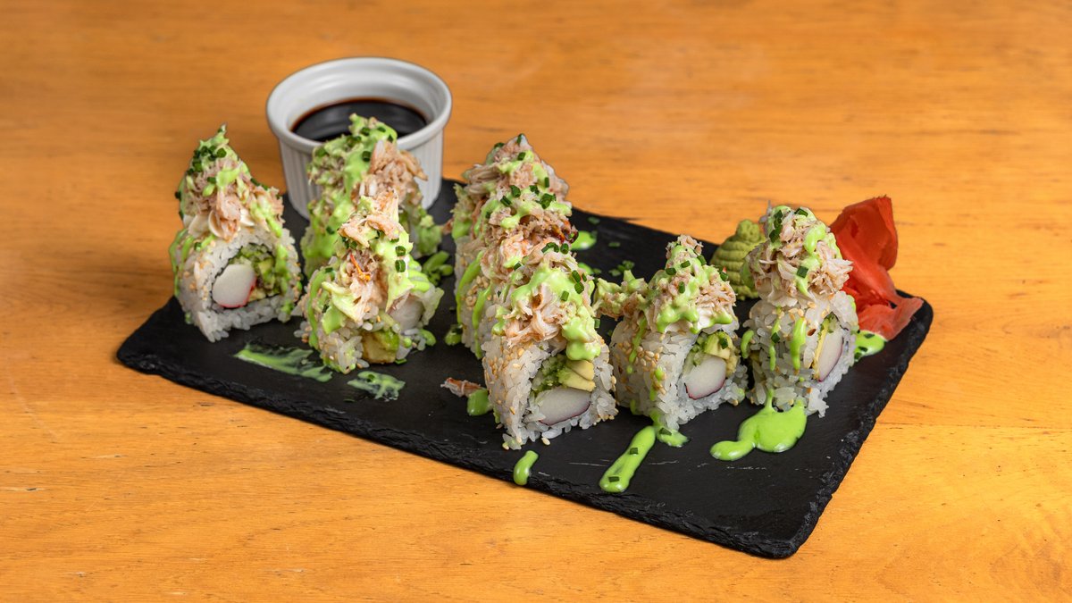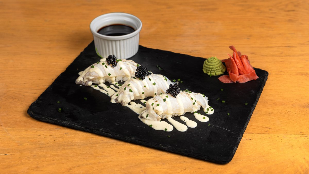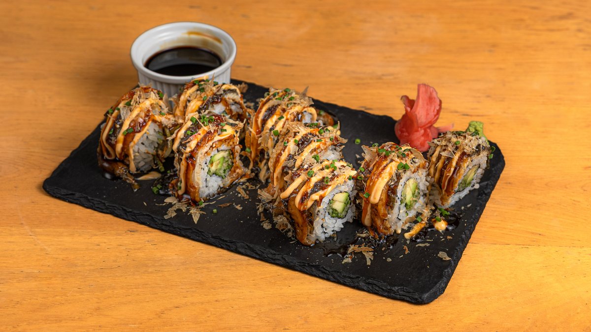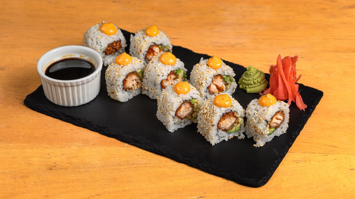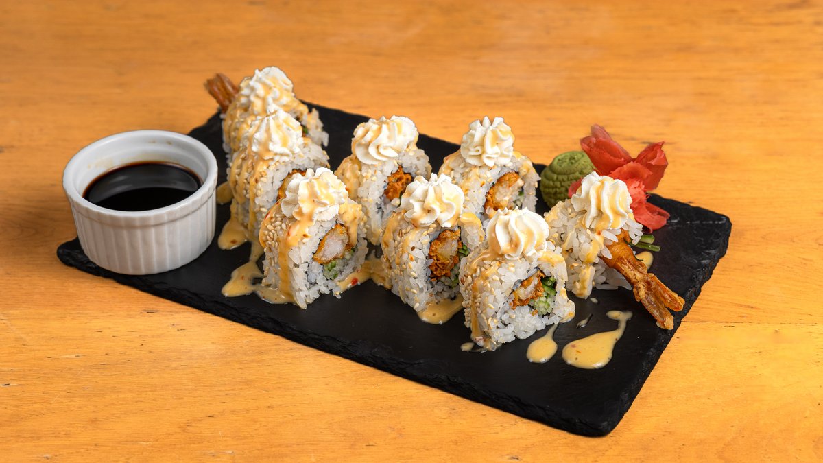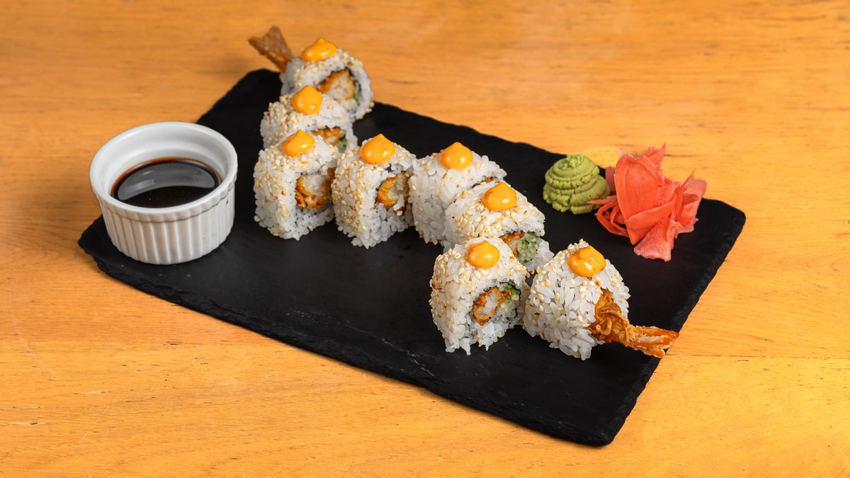 8 Rolls. Τεμπούρα γαρίδας, ρύζι ατμού, nori, μαύρο και άσπρο σουσάμι, τηγανητό κρεμμύδι, κόκκινο και πράσινο tobiko, μαγιονέζα εσπεριδοειδών και γλυκό τσίλι