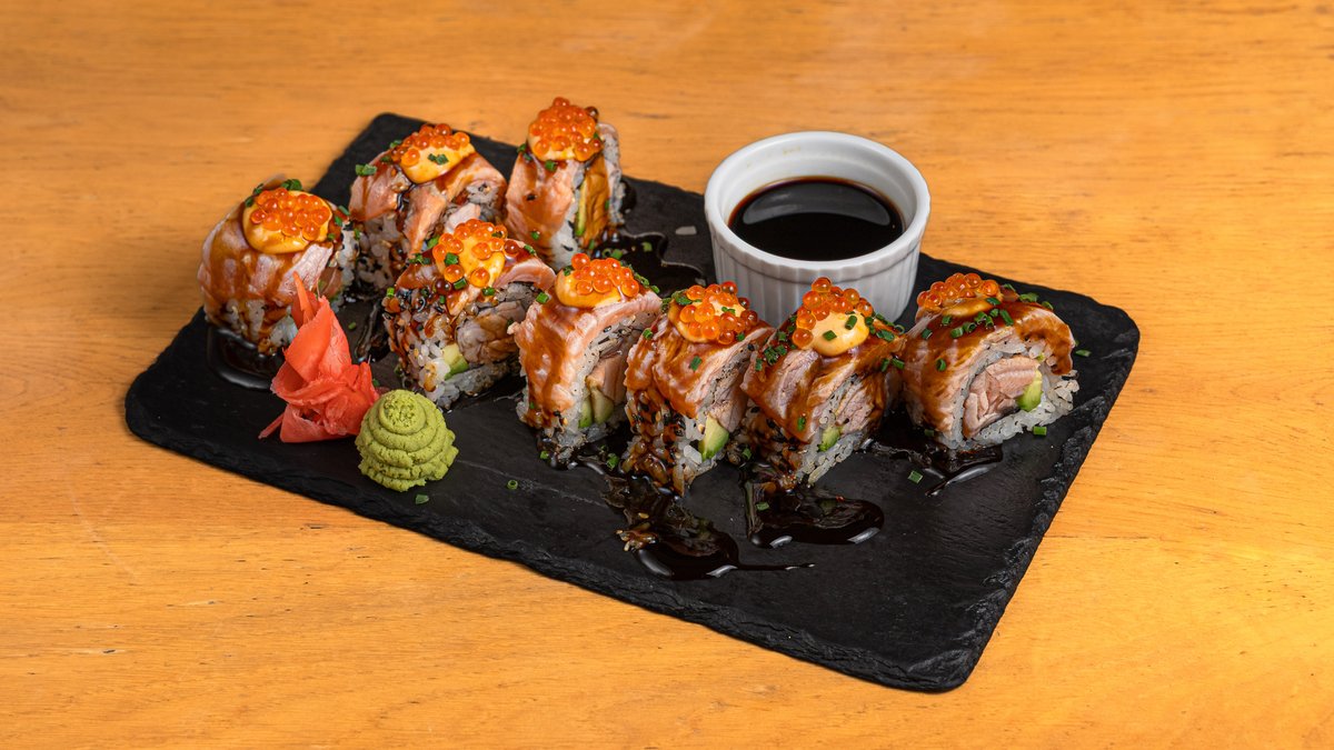 8 Rolls. Φιλέτο σολομού, ρύζι ατμού, nori, αβοκάντο, spicy μαγιονέζα σασίμι σολομού, φύλλο φυκιού, σάλτσα teriyaki, αυγοτάραχο σολομού