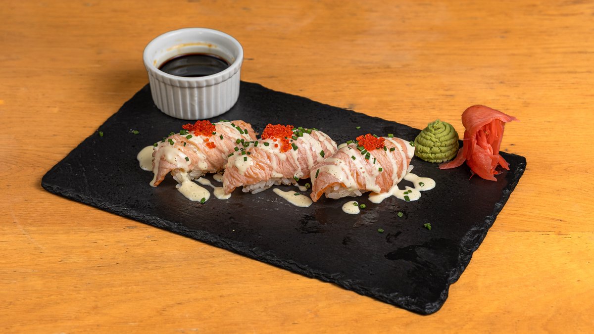 3 Τεμάχια. Ρύζι ατμού, σασίμι σολομού σε φύλλο φυκιού, σάλτσα μαγιονέζας εσπεριδοειδών ikura