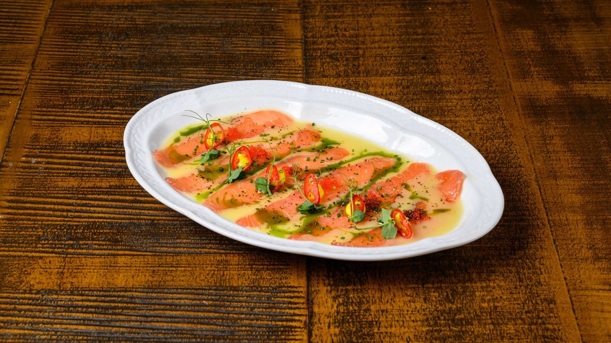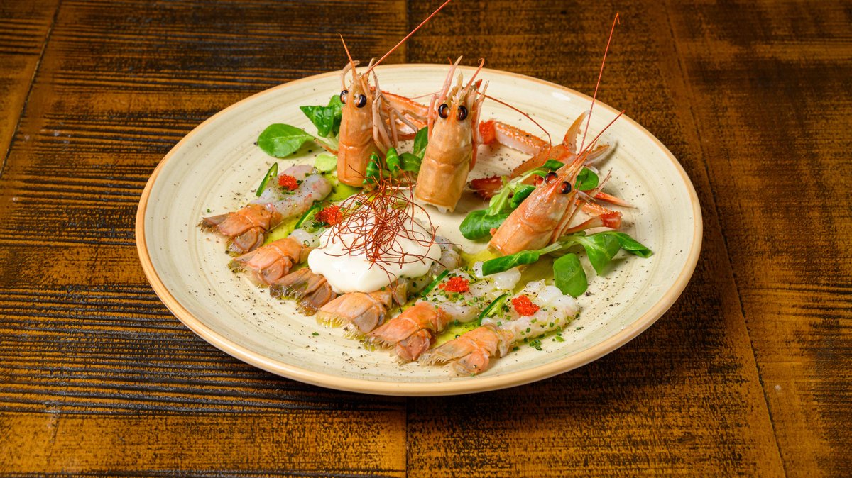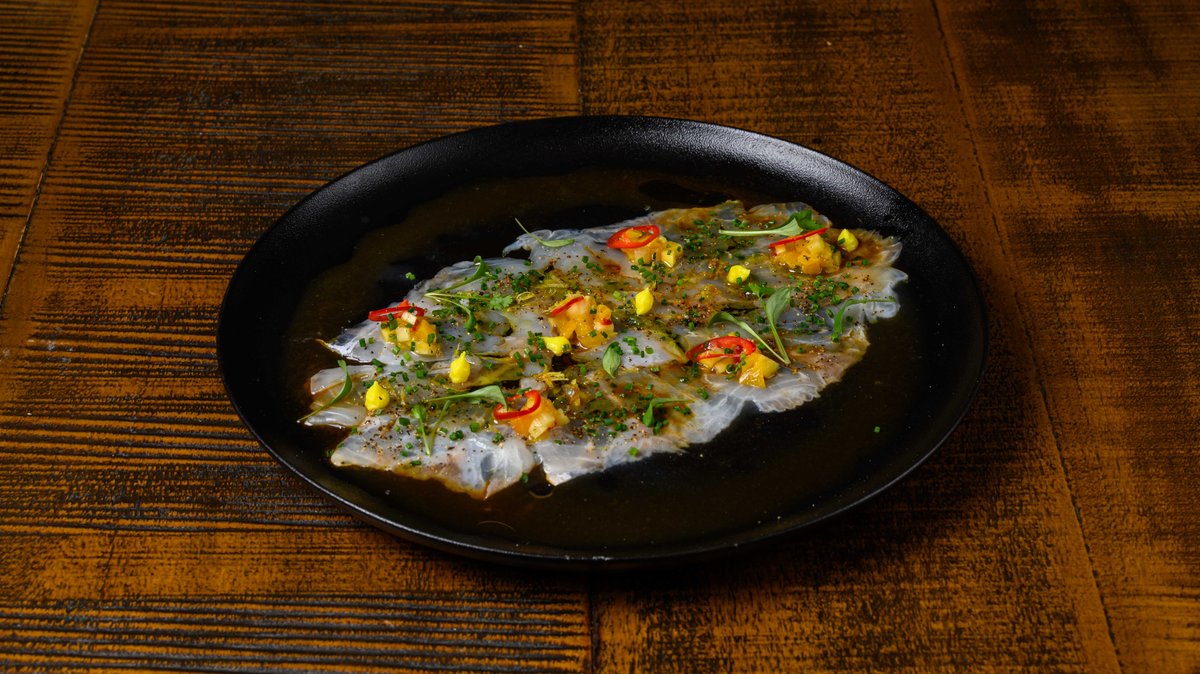 Λαβράκι, μάνγκο, καρέ τσίλι, χυμός πορτοκάλι και σως ponzu