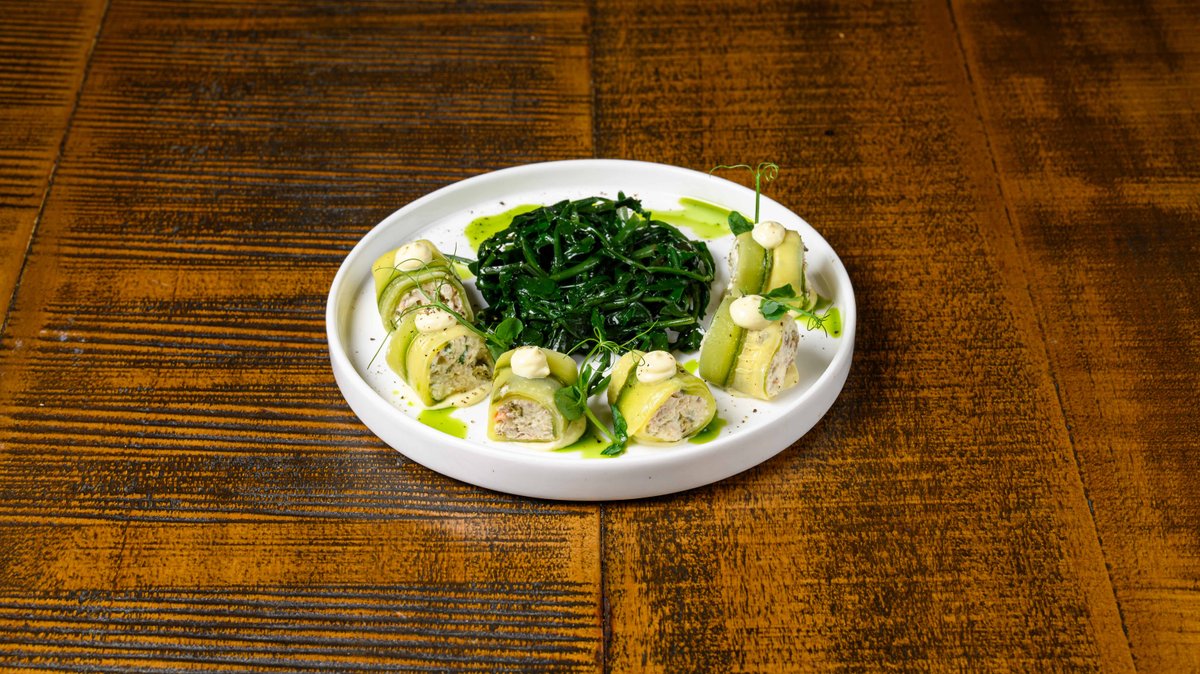 8 Rolls. Καβούρι, ρύζι ατμού, nori, αγγούρι, αβοκάντο, σάλτσα wasabi mayo, μαριναρισμένο καβούρι με μάνγκο και αγγούρι, σχοινόπρασο