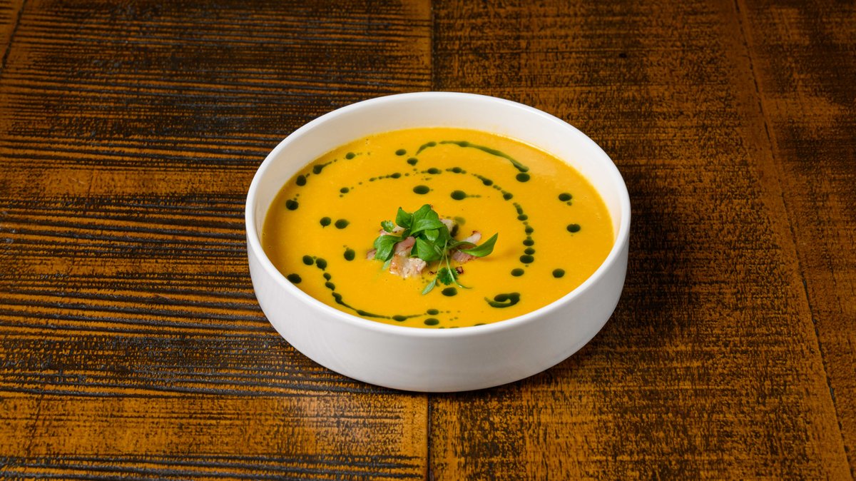Κολοκυθόσουπα Βελουτέ με Καπνιστό Χέλι