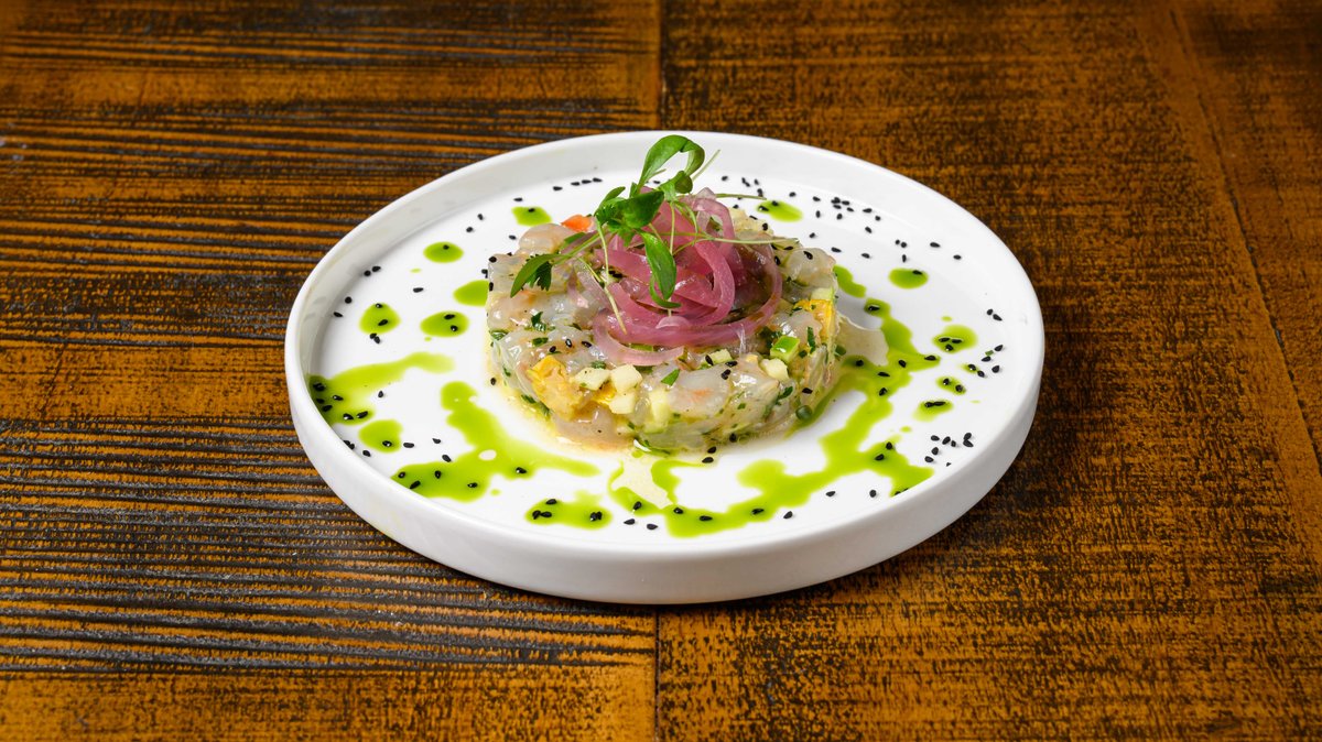 Μήλο, μάνγκο, γλυκιά πιπεριά, πίκλα κρεμμυδιού, σχοινόπρασο, μαύρο σουσάμι και βινεγκρέτ εσπεριδοειδών