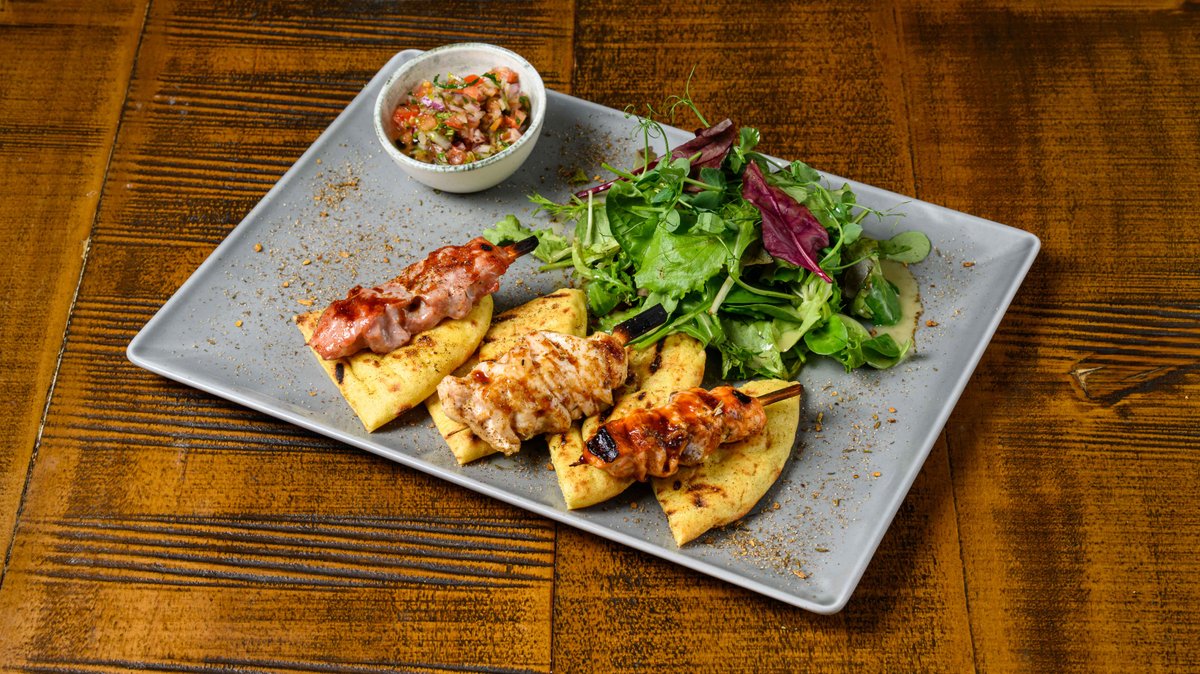Χειροποίητα σουβλάκια σολομού, ξιφία και τόνου με τραγανές λαδόπιτες. Συνοδεύεται με μικρή σαλάτα και pico de gallo