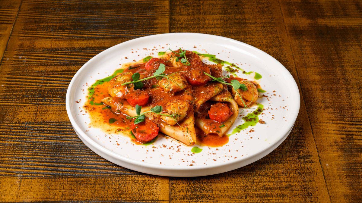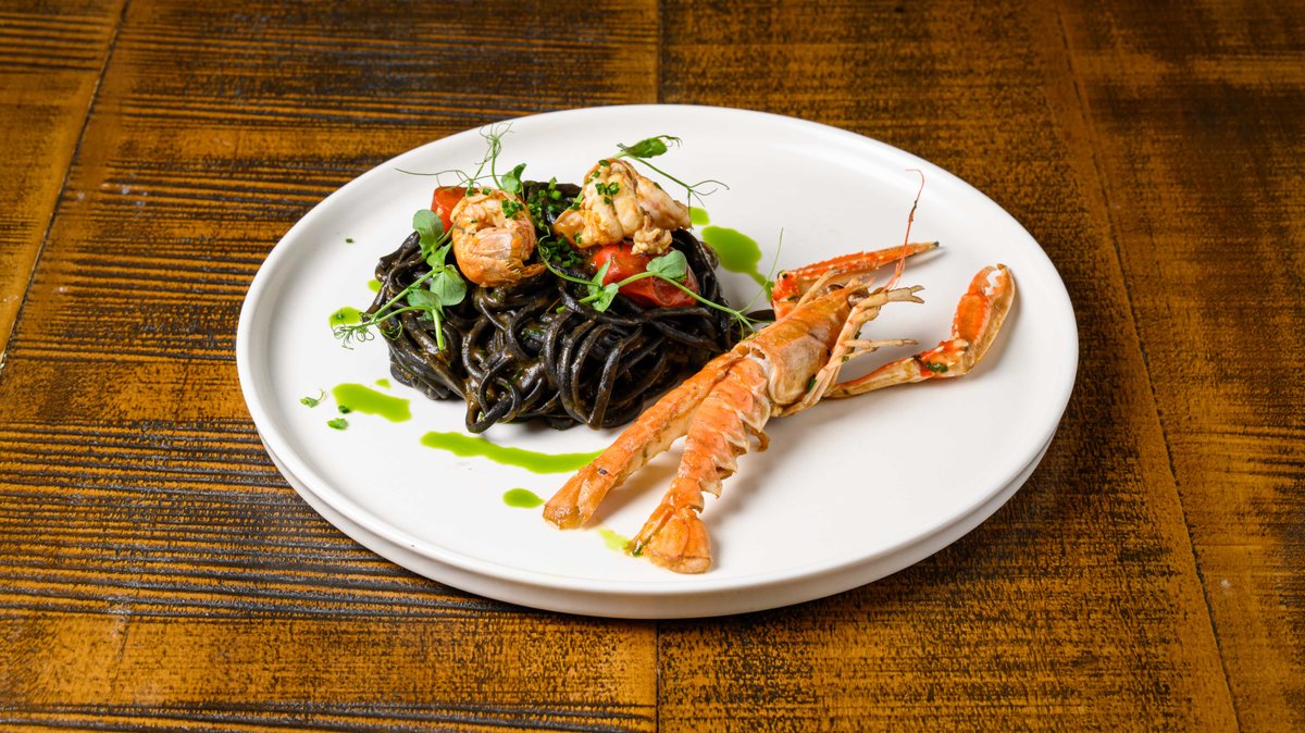 Χειροποίητες ταλιατέλες με μελάνι σουπιάς, τοματίνια κονφί, βασιλικός, ζωμός μπισκ, λάδι σκόρδου