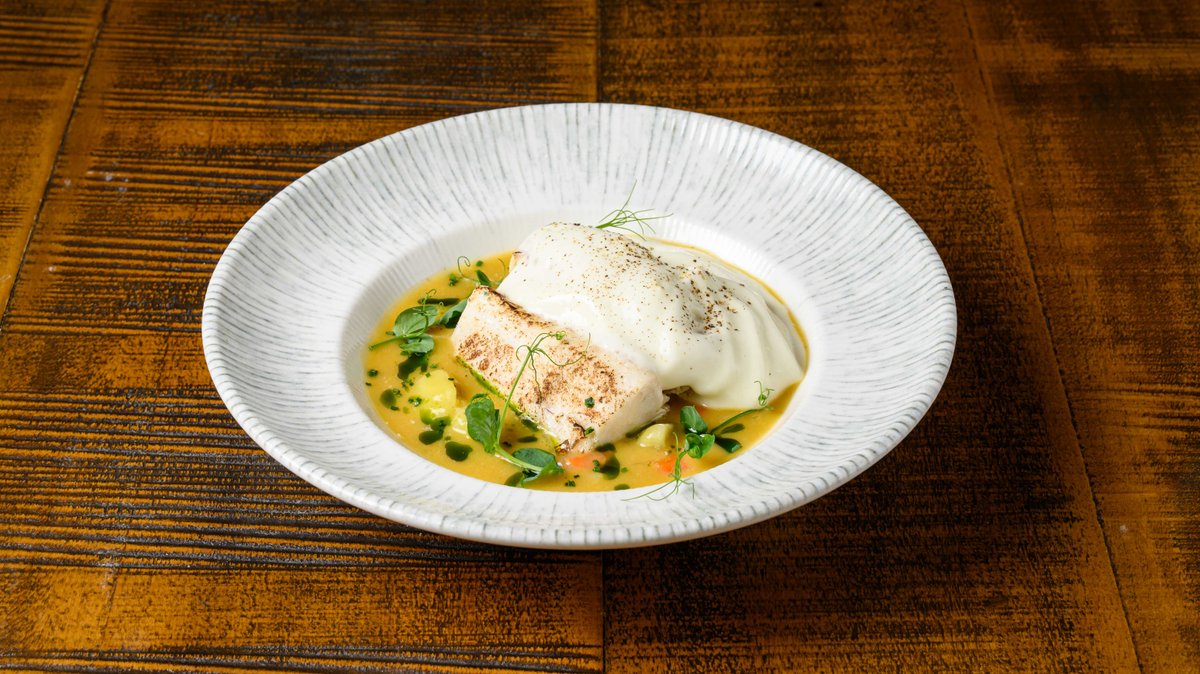 Φιλέτο μπακαλιάρου, καρότο, πατάτα, ούζο και αφρός αρωματικού λαδολέμονου
